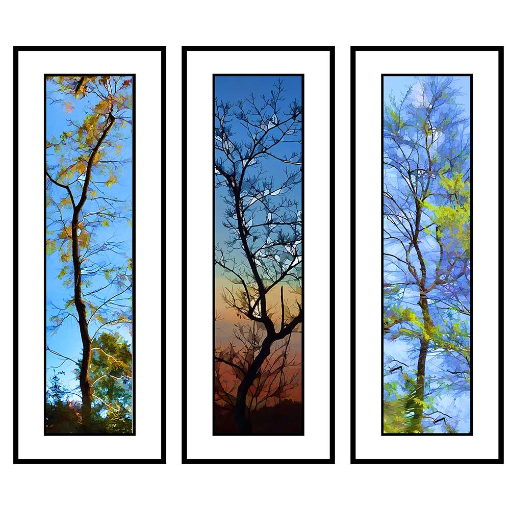 Slim, Branches at Sunrise, and Yellow Splotches in an abstract grouping of branches against a bright blue sky.