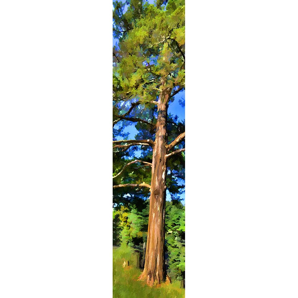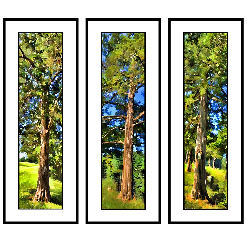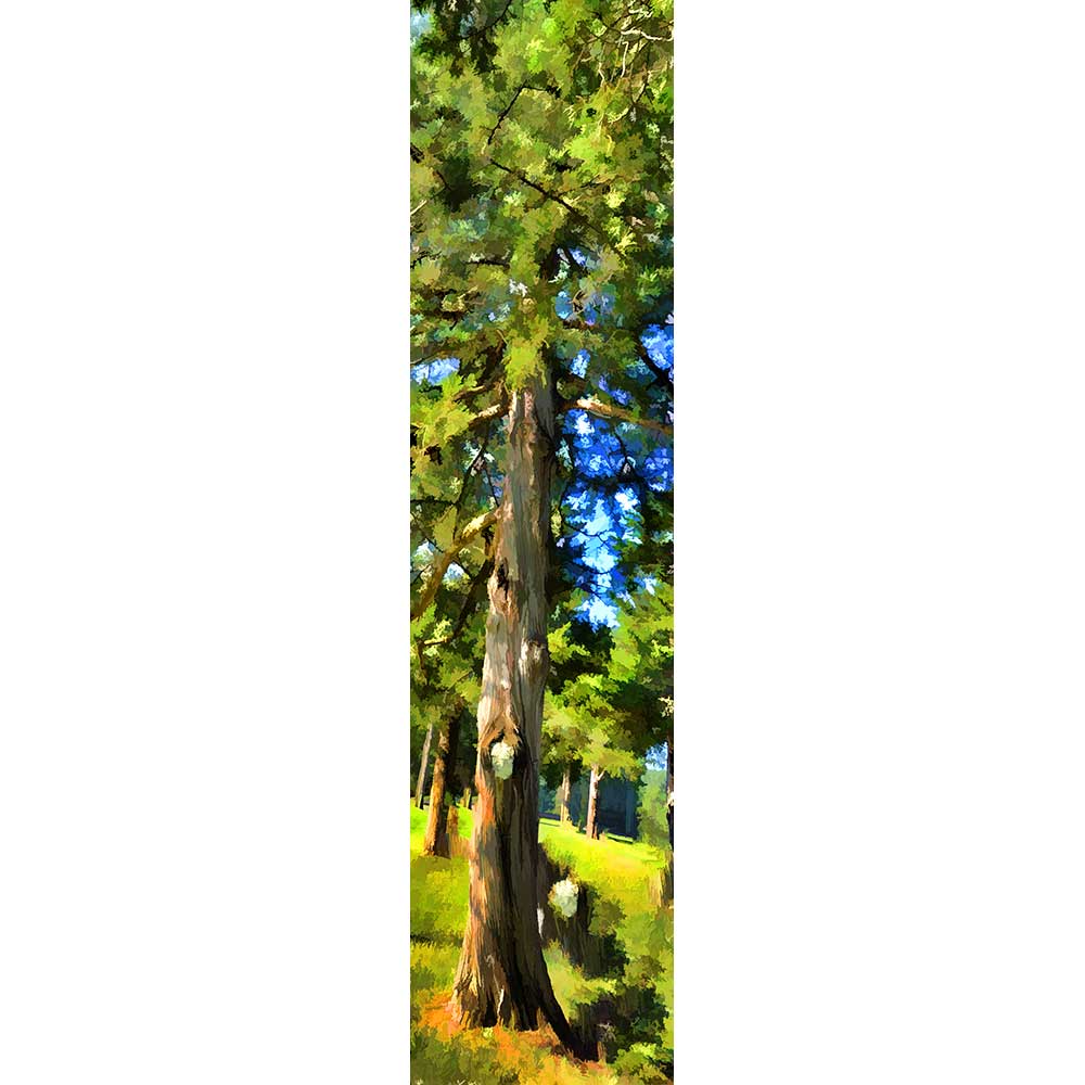 Cedar1, Cedar2, and Cedar3 in a grouping of old cedar trees in bright blue sky. Note the worn bark on the trees.