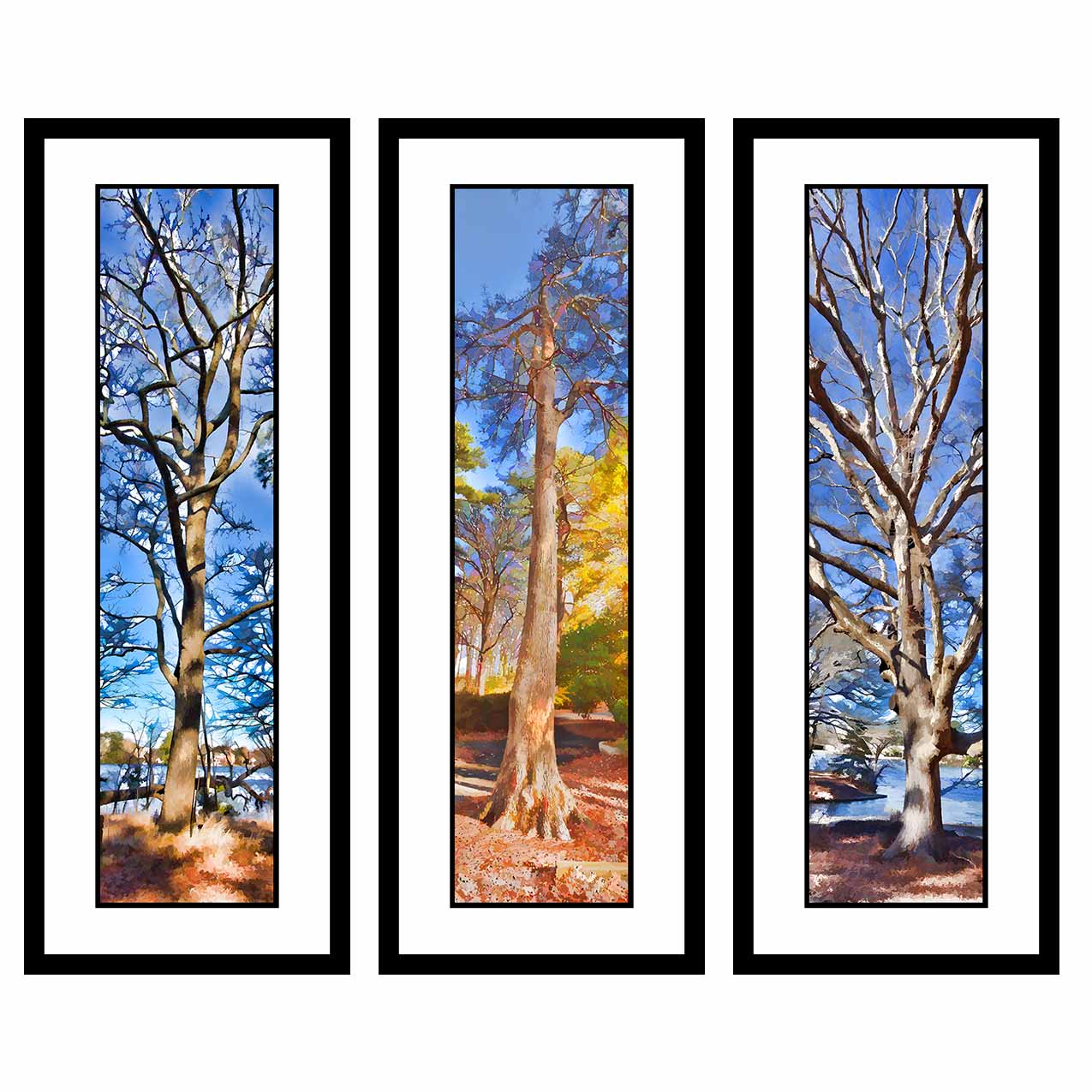Tangled Winter, Winter Color, and Lakeside Winter in a grouping of winter trees. Primarily blue and grey with a color splash in the middle.