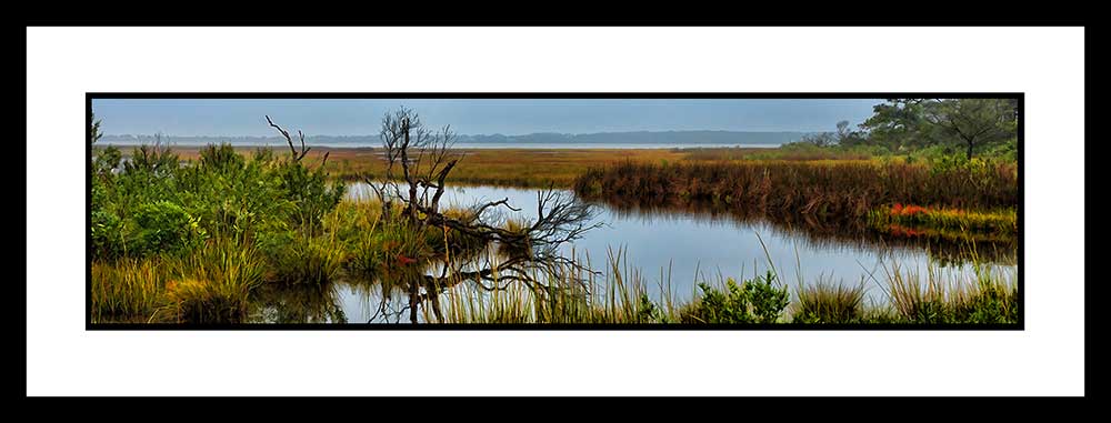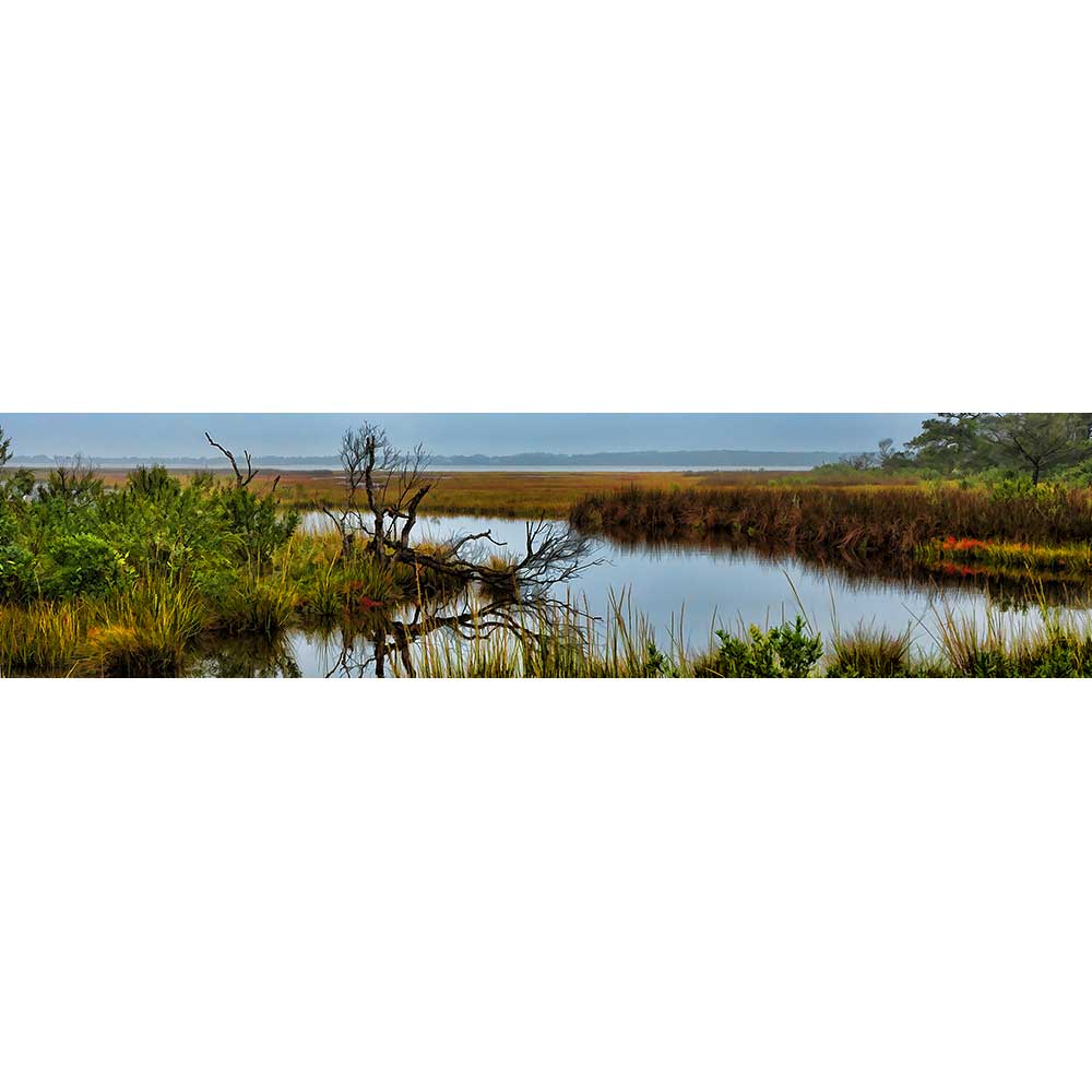 A bare branch is reflected in the clear water of a coastal stream. Low shrubs and tall, gold grasses bordering the stream stretch into the distance, where more streams join together, leading to the sea.