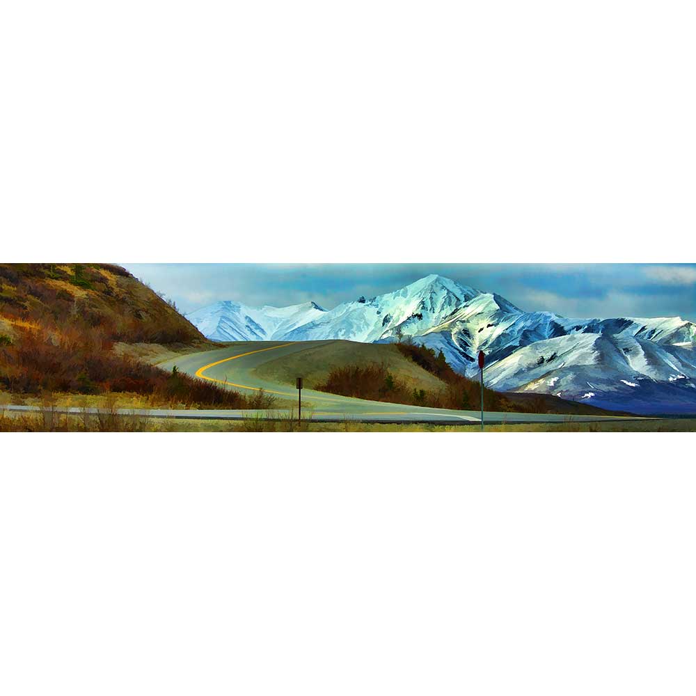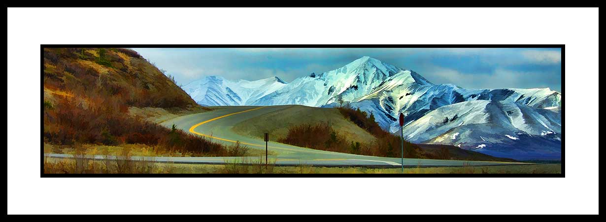 The road through the mountains of Denali National Park with snow coverd mountains in the distance.
