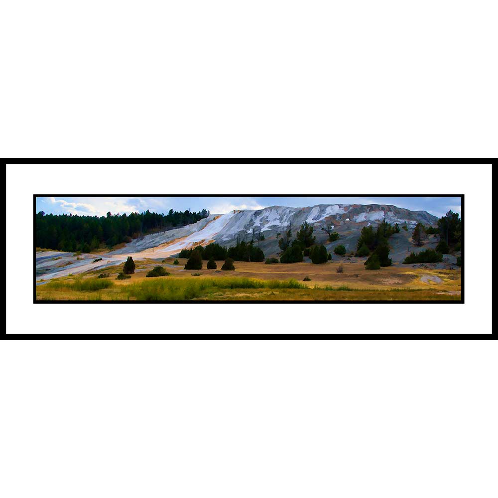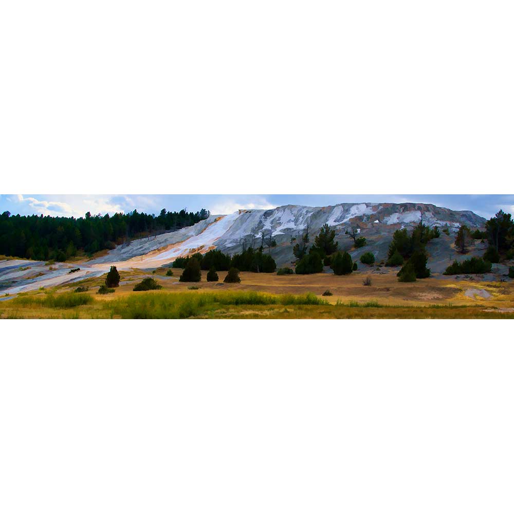 A white and yellow flow down Mammoth Hot Springs in Yellowstone. Hot water through limestone creates this area.
