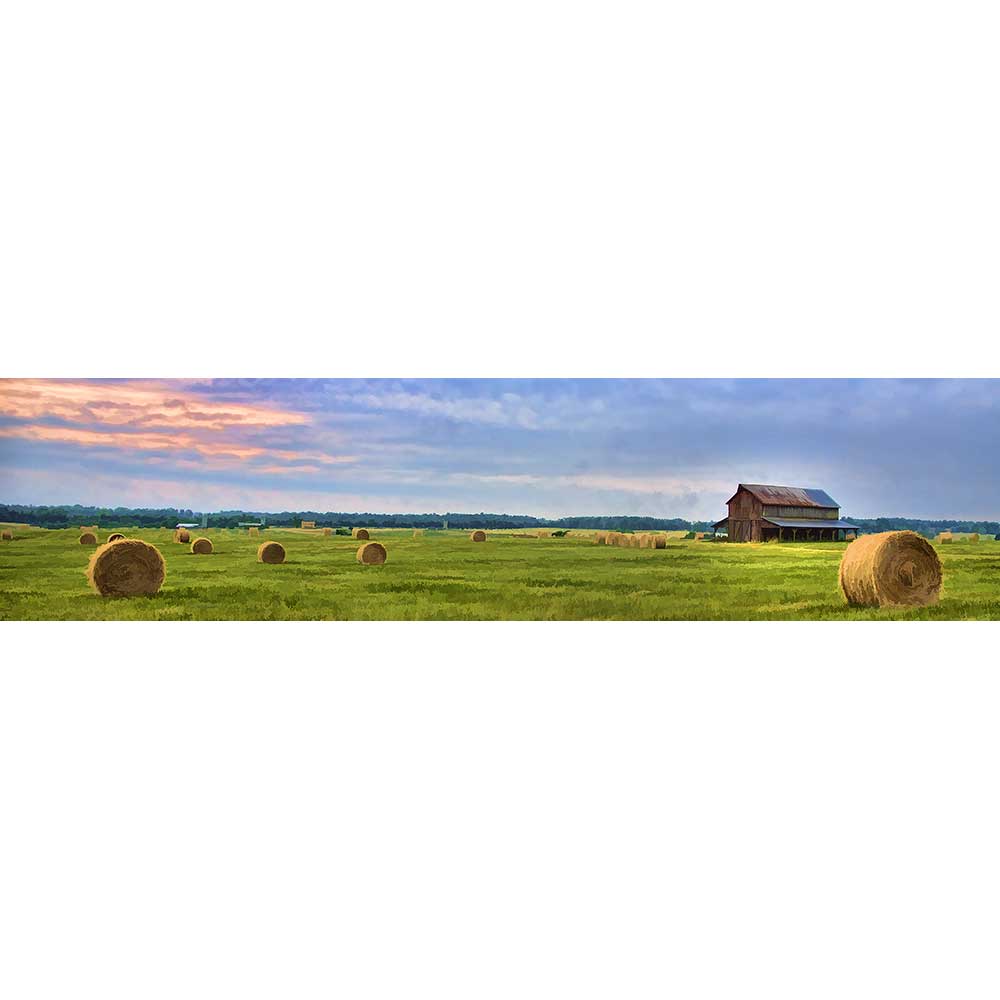 During hay time the hay rolls spread over the fields as far as the eye can see. A rustic barn with hay rolls in the fields at sunrise. You can smell the fresh hay.