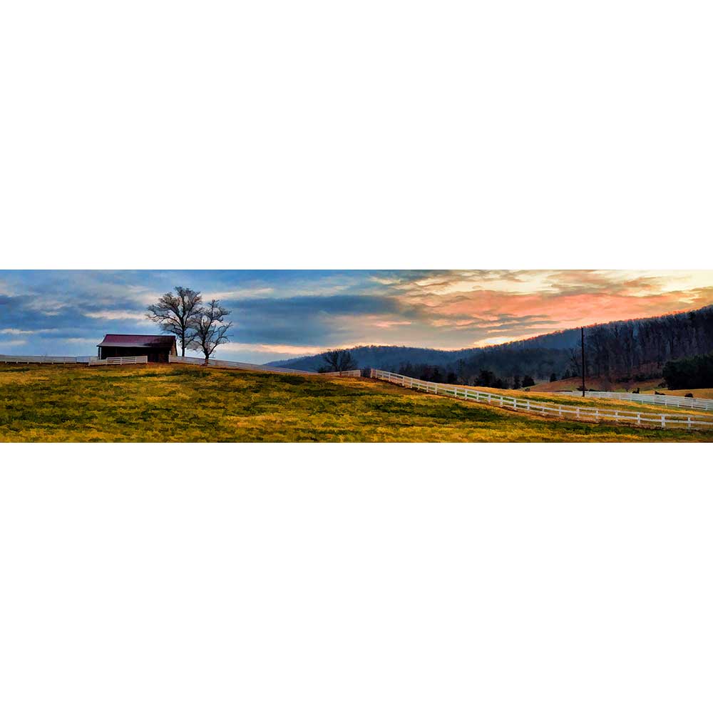 A red barn sits at the top of a hillside, its grasses turned gold and green in the light of sunrise. White fences separate the hill into several fields, a few cows in one of them sequestered near a forest to the east. The sun itself still lingers behind thin clouds, illuminating them in bright pinks, yellows, and oranges.