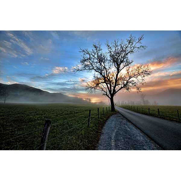A sunrise view of Cades Cove with a bare tree and mountains in the background.