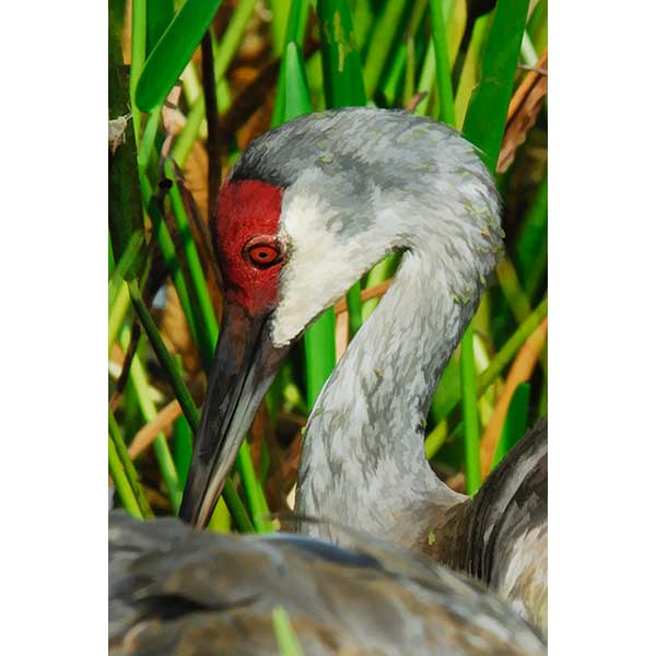 A detailed view of a Sandhill Crane in its striking breeding plumage.