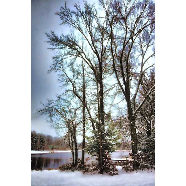 Trees by a lake with an incoming snow storm. Sunlight through the trees.