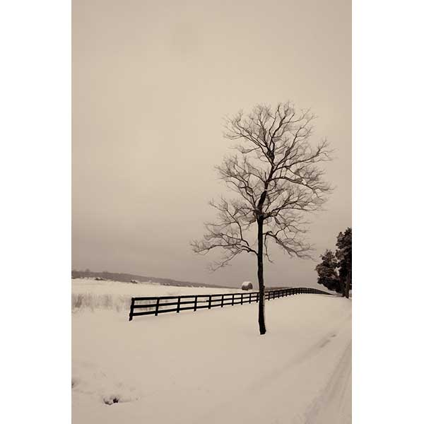 A solitary tree standing beside a weathered fence, both enveloped in fresh snow.