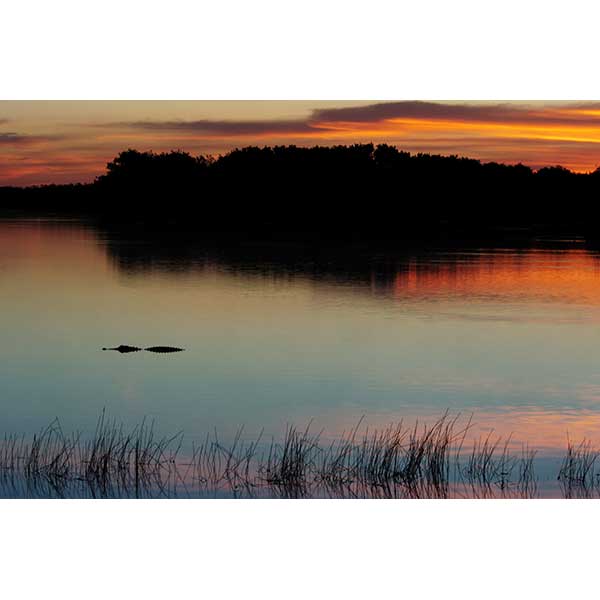 An alligator resting in Nine Mile Pond at sunrise within the Everglades.