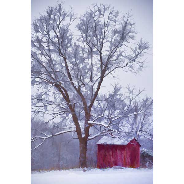 A red barn in a snowstorm dwarfed by a snow coverd tree. A burst of red in an otherwise black and white scene.