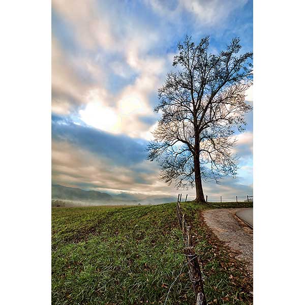 A tree by a country road with stormy clouds behind it.