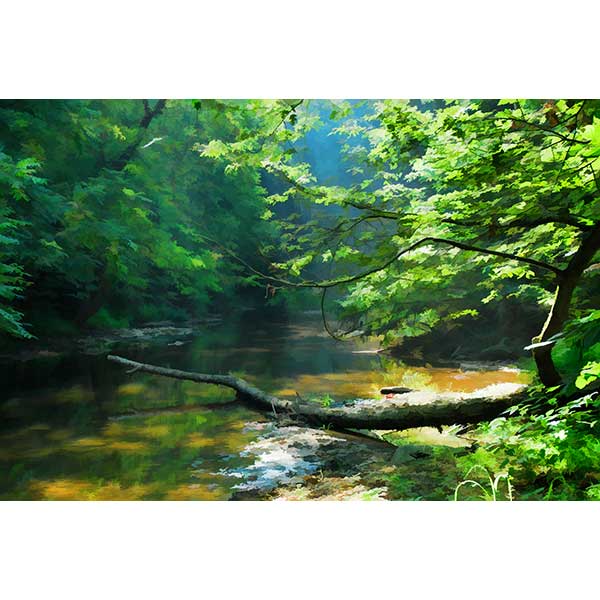 Stream flowing through a lush green forest with a fallen tree.