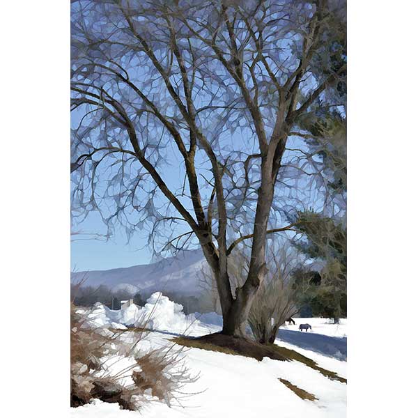 A winter tree on a snowy hillside with horses and a mountain in the background.