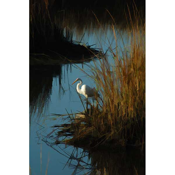 A great white egret standing by the water in the midst of high grass.