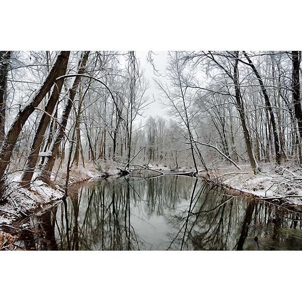Snow covered trees along a river reflected in the water below.
