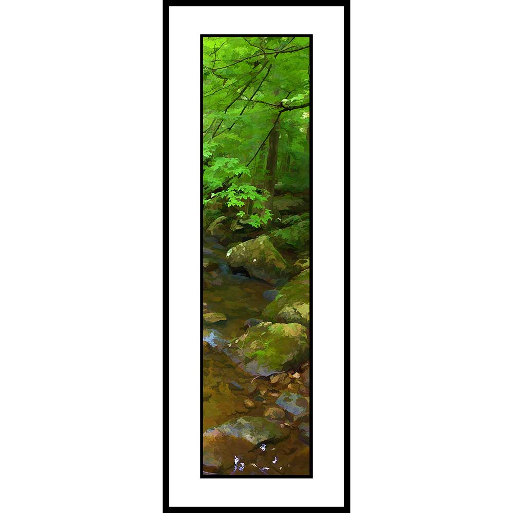Soft green trees by a rocky creek.