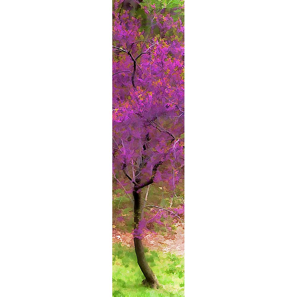 A vibrant redbud tree flourishes in the woods, its branches full with fuchsia blossoms and tipped with clusters of small green leaves.
