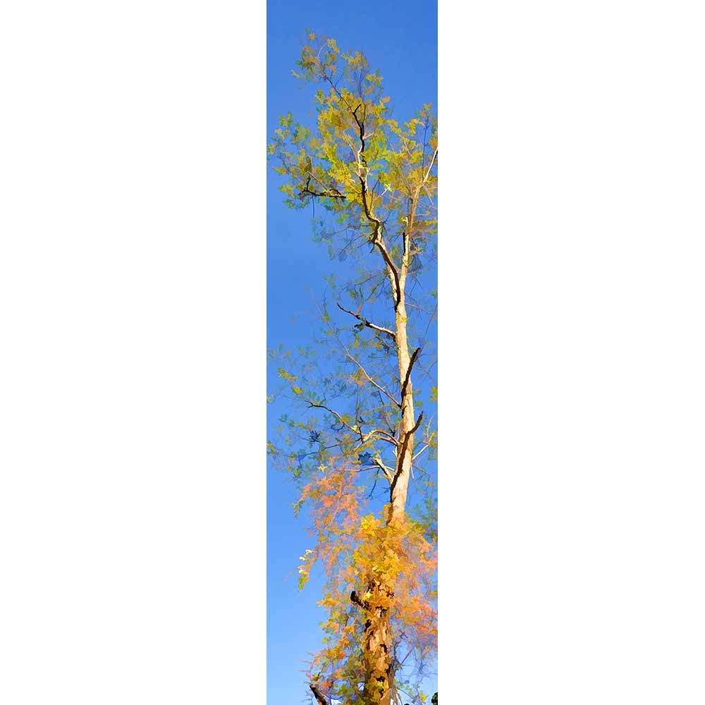 The top of a tall wispy tree against a bright blue sky with yellow and orange fall leaves.