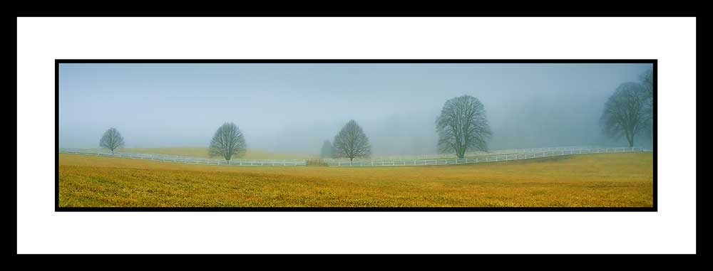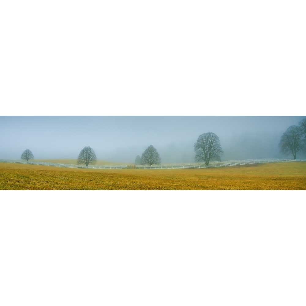 Five bare trees stand in a field of yellow crossed with a white fence. Fog obscures the distance in a gray haze, so the trees appear completely alone.